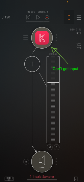 When koala is being used as an AUv3 plugin, you need to explicitly give it some input. If you load koala as an instrument (i.e. in the top slot) it can’t get input – this is not the fault of koala, its a limitation of AUv3 plugins (and also VST plugins etc)*
