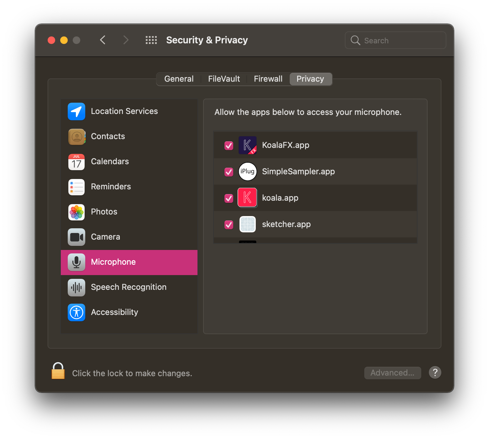 Click the “Privacy” tab, select “Microphone” on the left, and make sure “koala.app” has a tick next to it. If not, please tick it.