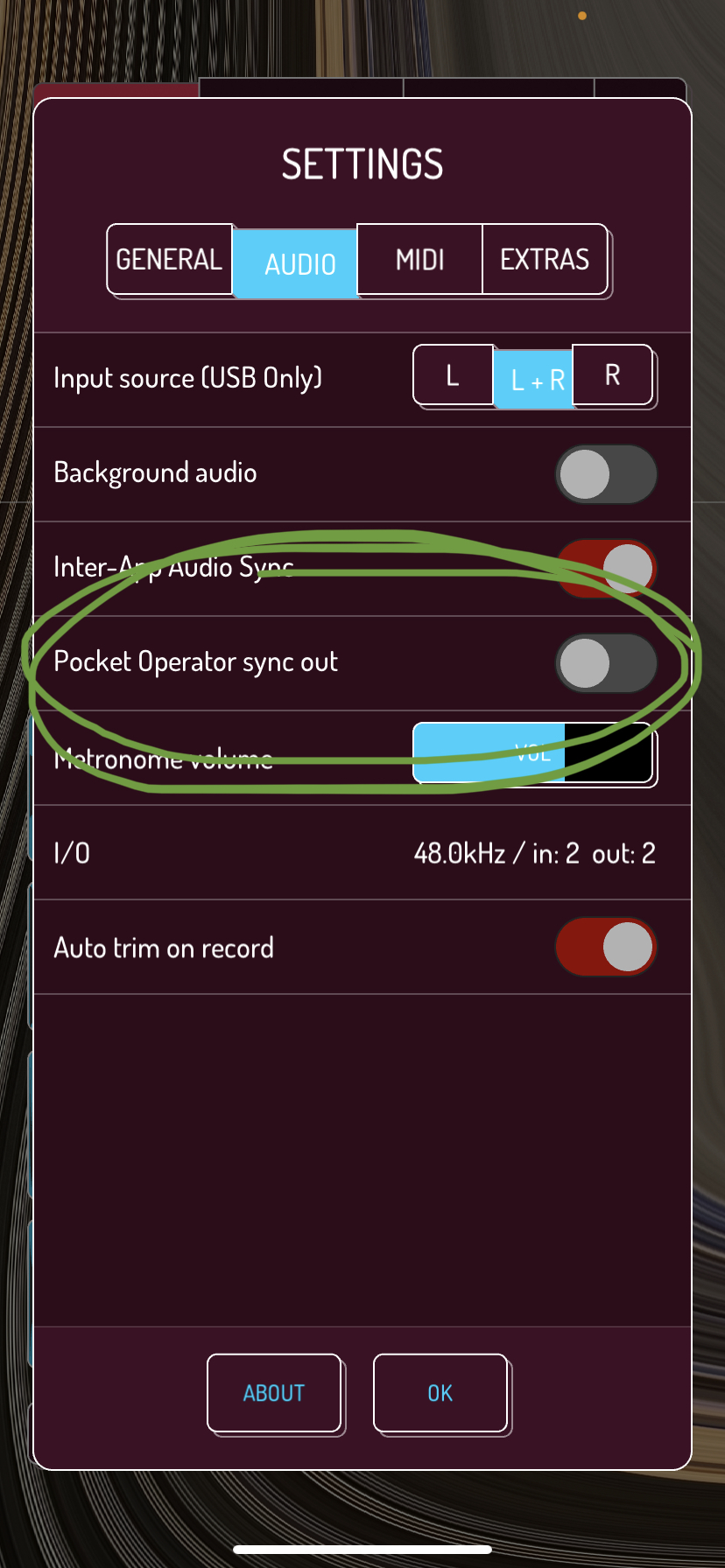 Do you have “Pocket operator sync” enabled in settings? (see below.) If so, PLEASE disable – pocket operator sync is for if you want to sync your Pocket Operator with koala – if you don’t have a Pocket Operator, or don’t know what a pocket operator is, PLEASE KEEP THIS SETTING SWITCHED OFF!!!! If you do have a pocket operator and you want to sync it to koala have a look here: https://www.koalasampler.com/help/midi/pocket-operator-sync-not-working.html