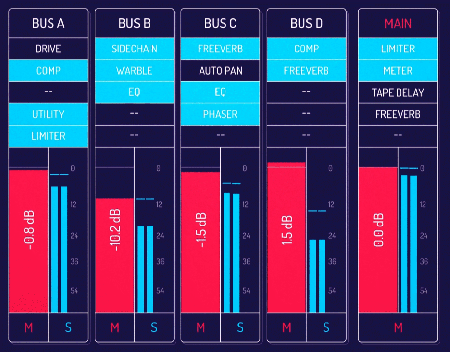 4 channel that you can route any sample to, plus 1 main bus, all with with mute/solo, faders, accurate metering and 5 effects slots each.